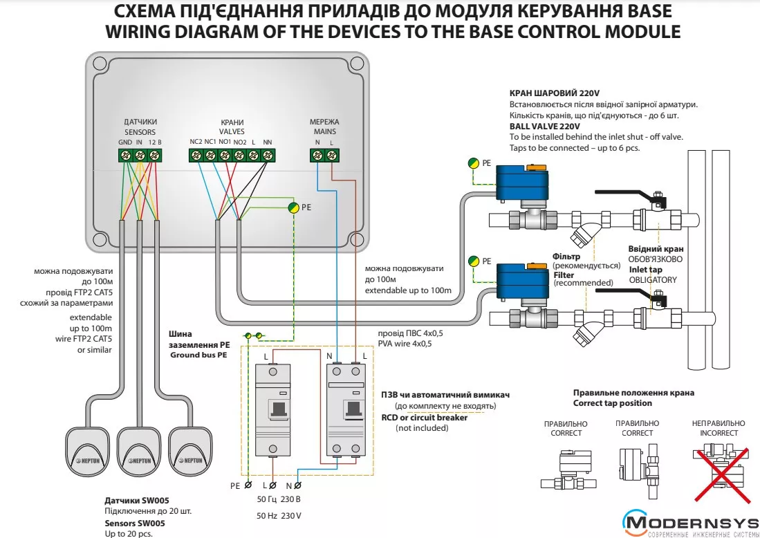 Усі компоненти системи мають високий рівень захисту від пилу та вологи. Модуль управління має клас захисту IP54, крани IP64, а датчики IP67.