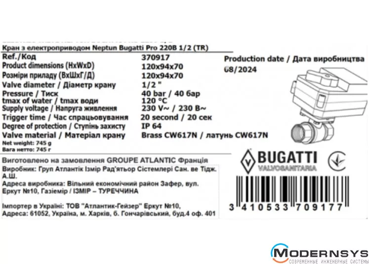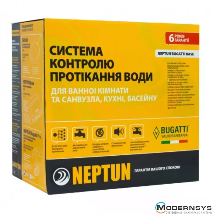 Neptun Bugatti Base (TR) - це обладнання від найвідомішого на ринку України бренду систем захисту від протікання французького концерну Groupe Atlantic. Пристрій проводиться на заводі Atlantic Group Izmir Radyator Systemleri Dignity. in Tij. A.Sh.» у Туреччині. Для забезпечення високої якості в комплекті використовуються італійські повнопрохідні крани Bugatti з латуні. Це надійне та ефективне рішення для захисту вашого приміщення від протікання.