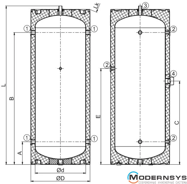 Бак виготовлений із сталевого листа та перевірений у 1,5 рази великим значенням робочого тиску, без внутрішнього покриття поверхні. Місткість ізольована твердою поліуретановою піною без вмісту фреонів товщиною 42 мм, яка має відмінні ізолюючі властивості. Верхня оболонка із сталі, покрита порошковим лаком.