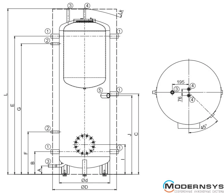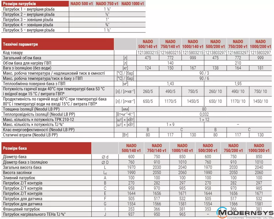 Акумулююча ємність NADO 140 v1 з теплоізоляцією Neodul 80 мм виготовляється у двох виконаннях: з фланцем або з патрубком G 6/4". Бак містить внутрішній емальований накопичувальний резервуар. У стандартному виконанні фланець і патрубок G 6/4" заглушені.