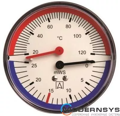 Комбінований прилад дозволяє одночасно контролювати тиск і температуру в опалювальних системах. Корпус приладу діаметром 80 мм виготовлений із сталевого листа та пофарбований у чорний колір. Передбачено червону маркувальну стрілку.