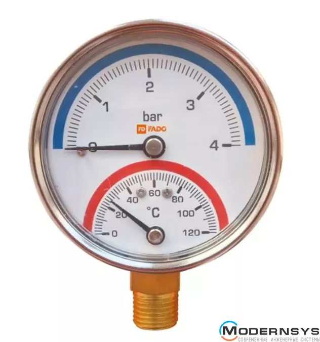 Опис: Термоманометр FADO (Фадо) вертикальний Д80 1/2" 120 ° С 4 бар
