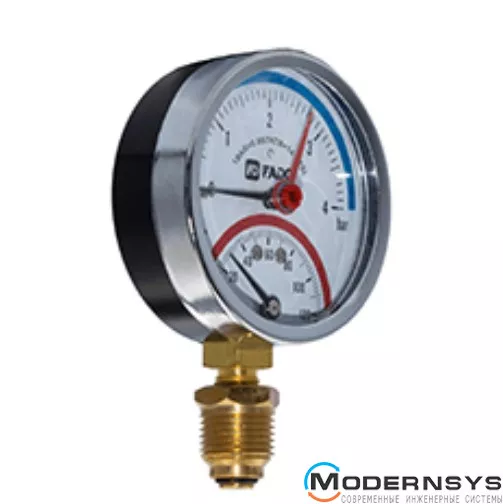 Термоманометр FADO фронтальний – повнопрохідний з підвищеним ресурсом. В одному корпусі деформаційний манометр та біметалічний термометр. Передбачено дві шкали – тиску та температури. Клас точності – 1,6. Діаметр корпусу – 63 мм. Діапазон вимірюваних температур – від 0 до 120°С, тиску – від 0 до 6 бар. Приєднання – осьове (заднє). Діаметр приєднання – ½”.