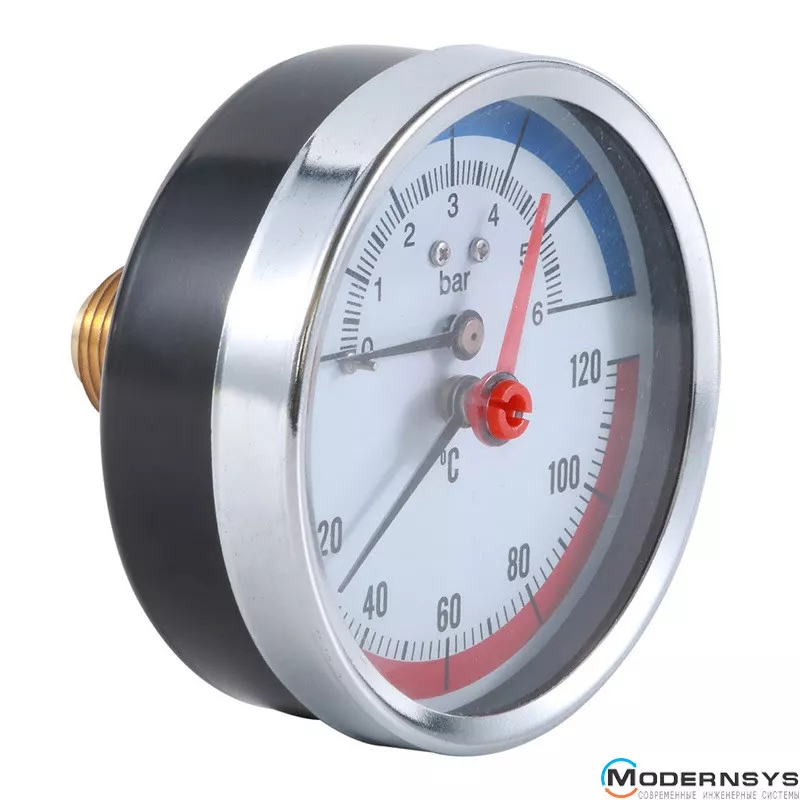 Термоманометр - це комбінований пристрій для вимірювання тиску та температури. Елемент вимірювання тиску – трубка Бурдона, елемент вимірювання температури – біметалічна стрічка. Перевагою цих приладів є використання однієї точки підключення 1/2'' BSP для одночасного вимірювання тиску та температури.