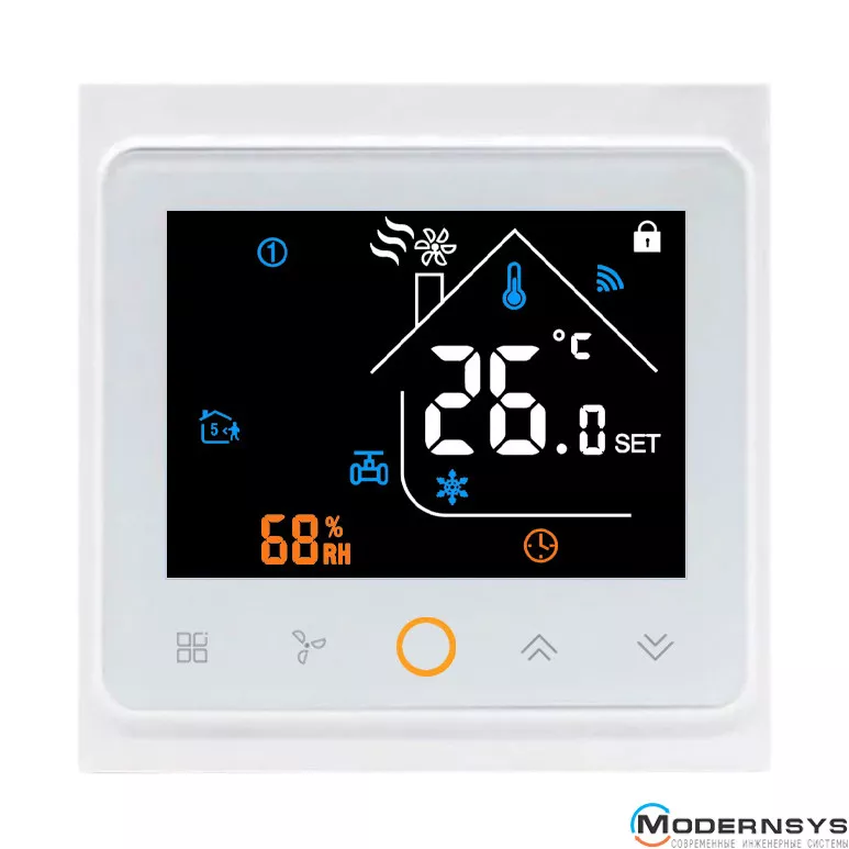 Термостат підтримує режим нагрівання/охолодження/циркуляція, має вбудований датчик вологості та можливість відключати охолодження при підвищеній вологості. Підтримує управління вентилятором як на 230В (змінний струм) так і з сигналом управління 0-10 (постійний струм) з трьома швидкостями обертання.