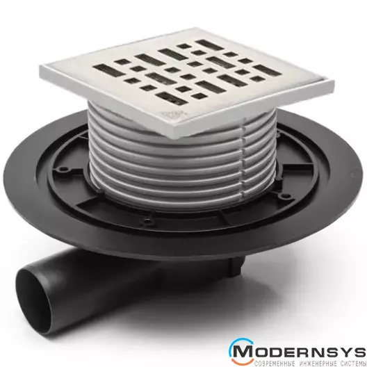 Двокорпусний трап з дизайнерськими ґратами Фокус. Спеціальний фартух допоможе зміцнити гідроізоляційний шар на стику трапу з бетонною стяжкою. Можливість регулювання висоти монтажу +/- 54 мм, а також збільшення монтажу висоти завдяки використанню вставного елемента. Грати виготовлені з шліфованої нержавіючої сталі товщиною 5 мм, завдяки чому трап має дуже привабливий зовнішній вигляд і тривалий термін служби.