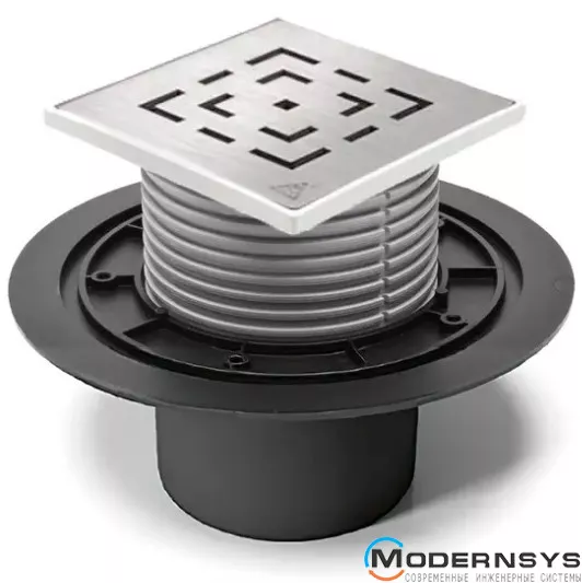 Двокорпусний трап з дизайнерськими ґратами Лабіринт. Спеціальний фартух допоможе зміцнити гідроізоляційний шар на стику трапу з бетонною стяжкою. Можливість регулювання висоти монтажу +/- 54 мм, а також збільшення монтажу висоти завдяки використанню вставного елемента. Грати виготовлені з шліфованої нержавіючої сталі товщиною 5 мм, завдяки чому трап має дуже привабливий зовнішній вигляд і тривалий термін служби.