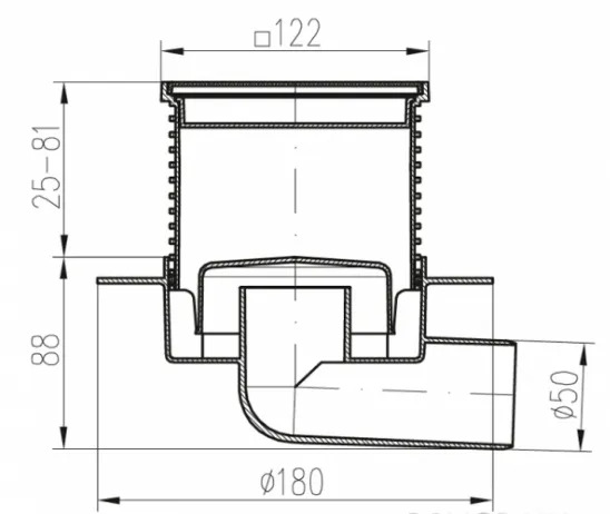 Трап має горизонтальне підключення. Пропускна здатність складає 50 літрів за хвилину.