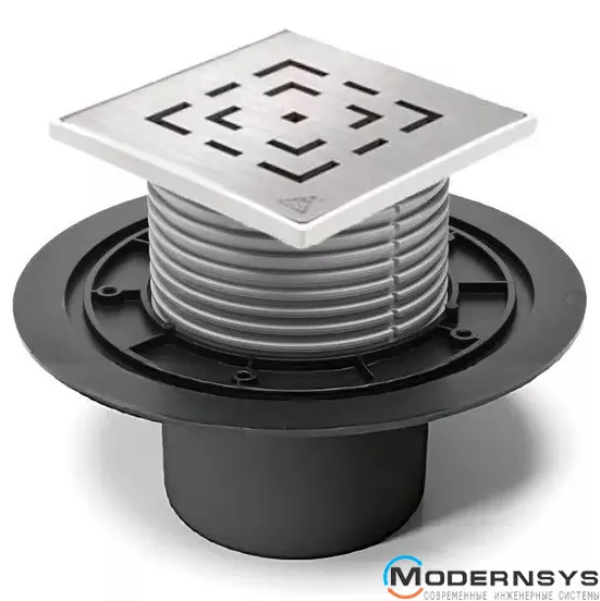Двокорпусний трап з дизайнерськими ґратами Лабіринт. Спеціальний фартух допоможе зміцнити гідроізоляційний шар на стику трапу з бетонною стяжкою. Можливість регулювання висоти монтажу +/- 54 мм, а також збільшення монтажу висоти завдяки використанню вставного елемента. Грати виготовлені з шліфованої нержавіючої сталі товщиною 5 мм, завдяки чому трап має дуже привабливий зовнішній вигляд і тривалий термін служби.