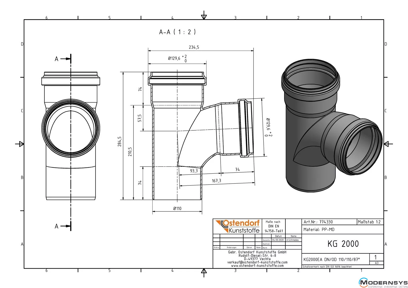 Технічні характеристики: Трійник каналізаційний Ostendorf (Остендорф) KG2000EA 110х110 87°