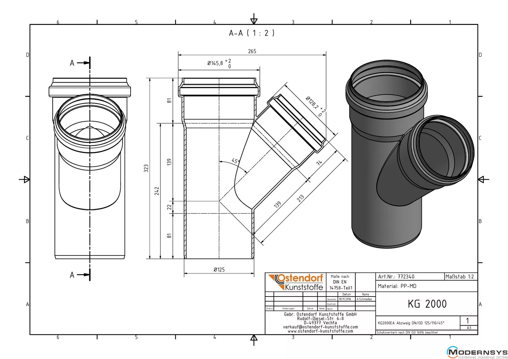Технічні характеристики: Трійник каналізаційний Ostendorf (Остендорф) KG2000EA 125х110 45°