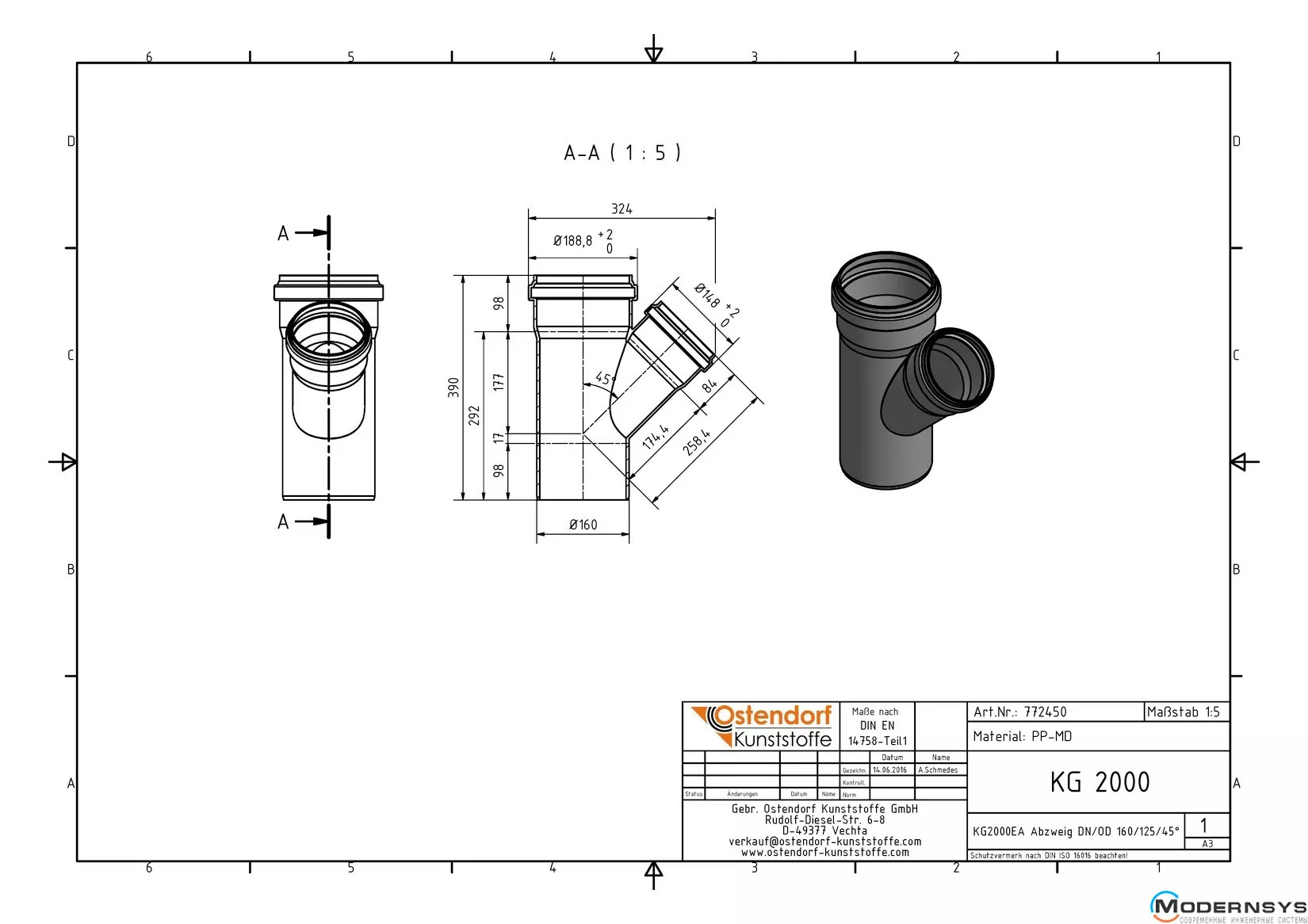 Технічні характеристики: Трійник каналізаційний Ostendorf (Остендорф) KG2000EA 150х125 45°