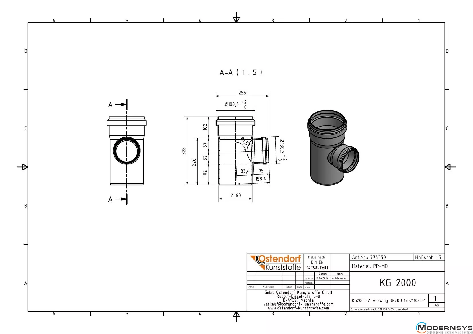 Технічні характеристики: Трійник каналізаційний Ostendorf (Остендорф) KG2000EA 150х110 87°