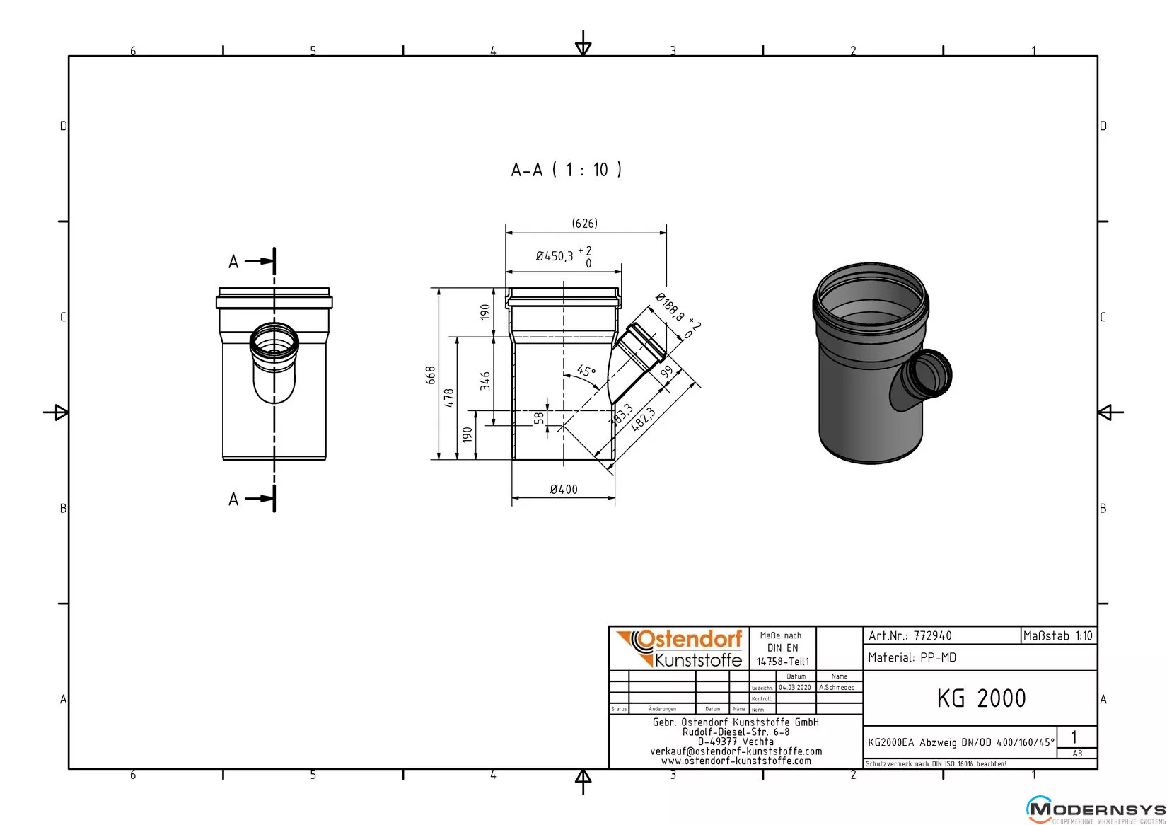 Технічні характеристики: Трійник каналізаційний Ostendorf (Остендорф) KG2000EA 400х150 45°