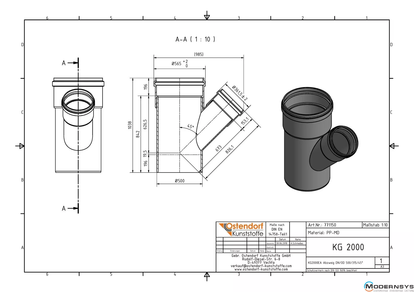 Технічні характеристики: Трійник каналізаційний Ostendorf (Остендорф) KG2000EA 500х315 45°