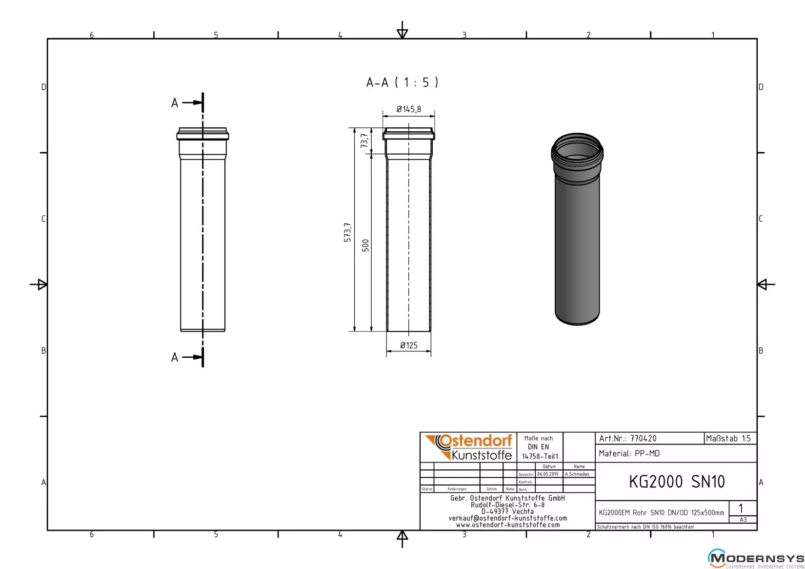 Опис: Труба каналізаційна Ostendorf (Остендорф) KG2000EM 125х500 мм