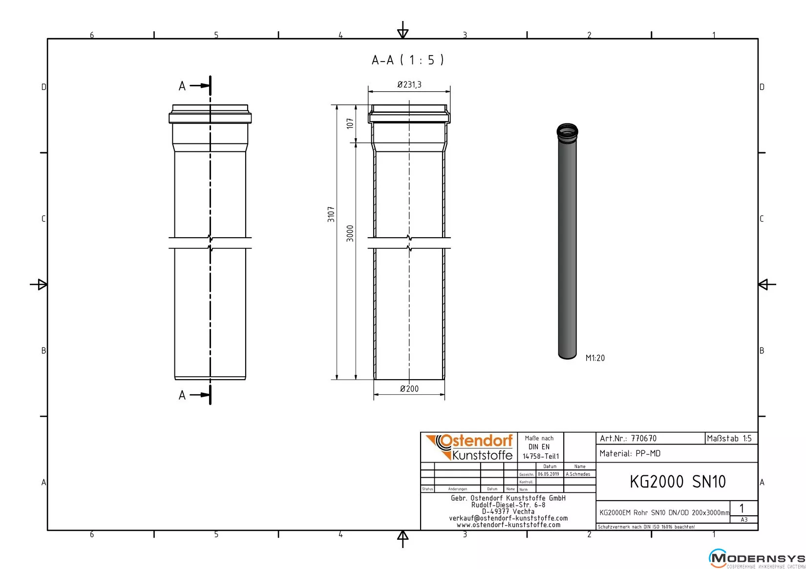 Технічні характеристики: Труба каналізаційна Ostendorf (Остендорф) KG2000EM 200х3000 мм