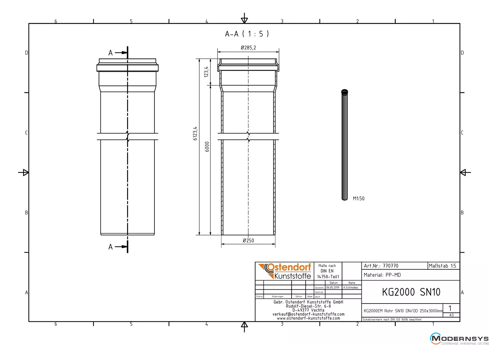 Технічні характеристики: Труба каналізаційна Ostendorf (Остендорф) KG2000EM 250х6000 мм