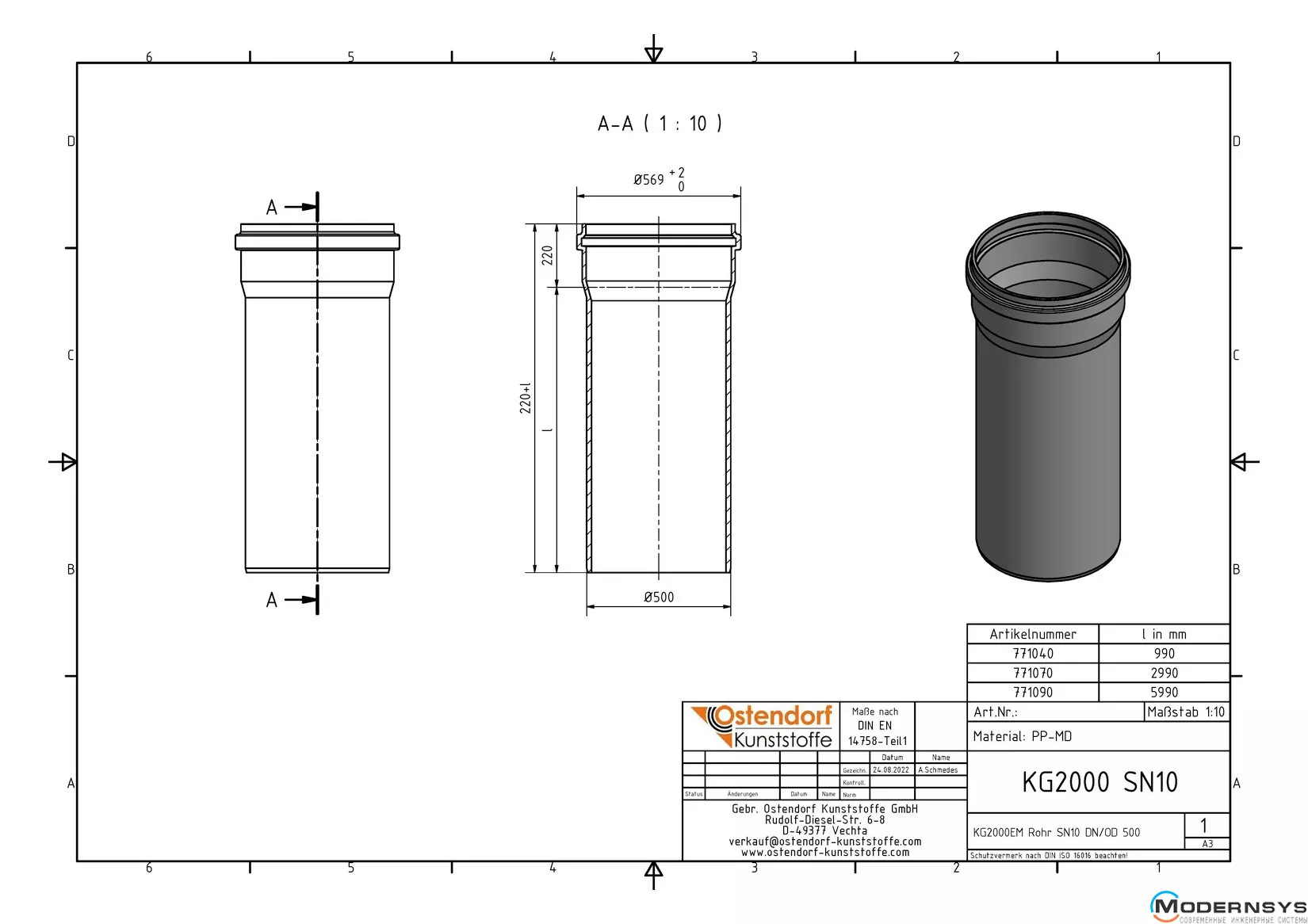 Технічні характеристики: Труба каналізаційна Ostendorf (Остендорф) KG2000EM 500х3000 мм