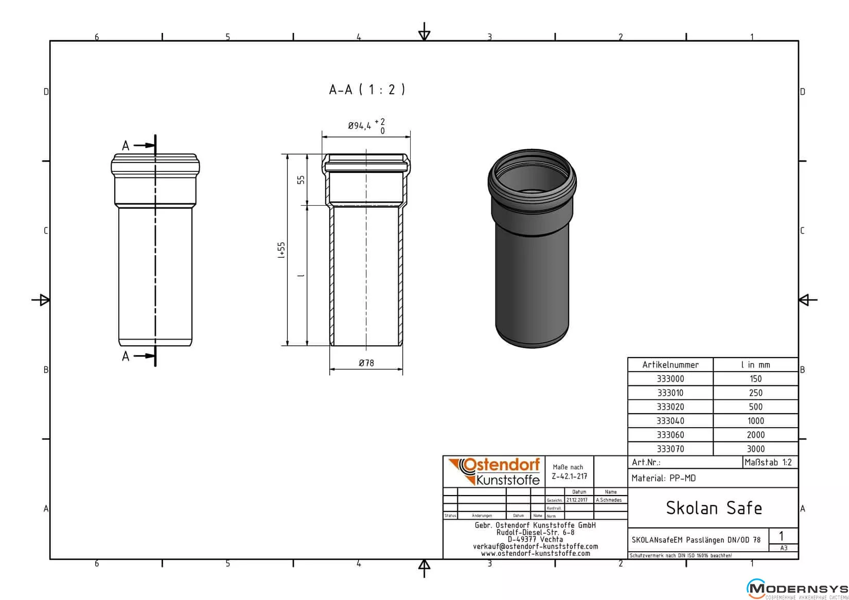 Бренд: Ostendorf; Тип товару: Труба; Вид каналізації: Внутрішня; Тип каналізації: Безшумна; Колір: Світло сірий; Діаметр (мм): 75; Товщина стінки (мм): 4.5; Довжина (мм): 250; Матеріал: Поліпропілен PPR; Виробник: Німеччина