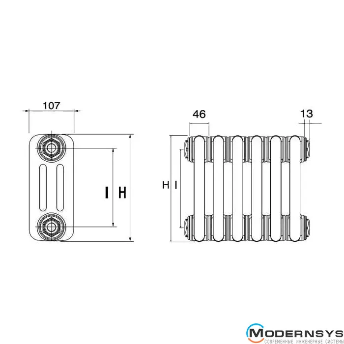 Трубчастий радіатор DeLonghi Multicolumn H=300 3-2 (секцій) конфігурація 99 (бічне 11/4") RAL9016 нижнє підключення, Підключення радіатора: Бокове, Виконання: Горизонтальний, Колір: Білий, Діаметр вхід/вихід: 1 1/4", Висота (мм): 300, Ширина (мм): 92, Глибина (мм): 107, фото Трубчастий радіатор DeLonghi Multicolumn H=300 3-2 (секцій) конфігурація 99 (бічне 11/4") RAL9016 нижнє підключення