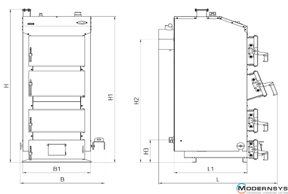 - Система дверцят забезпечує зручне обслуговування та експлуатацію котла;