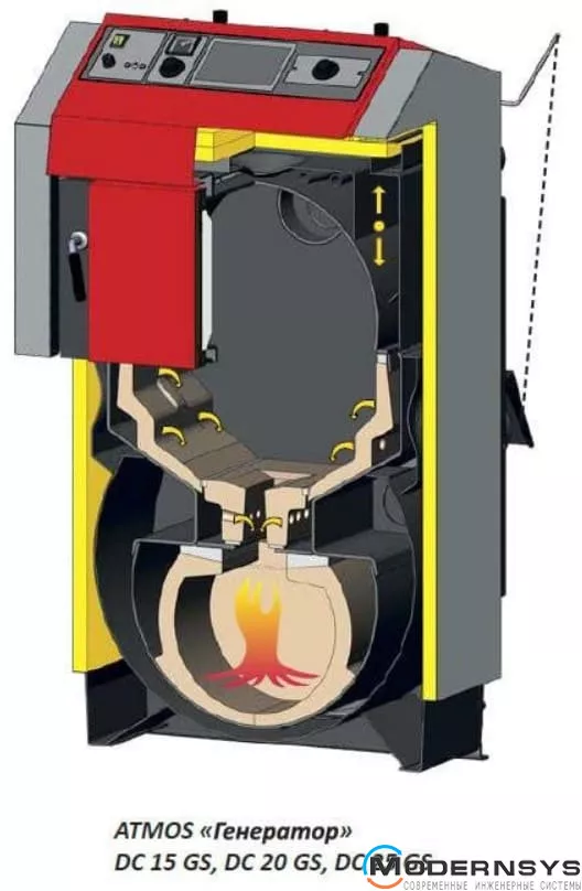 Котли ATMOS "Генератор" DC 20 GS - DC 70 GSX. Піролізні котли цієї серії відрізняються прямокутною топкою, з двох сторін викладеною спеціальною жаростійкою керамікою, в нижній частині обладнаної спеціальними отворами для приводу заздалегідь підігрітого примарного повітря, армованої металокерамічної газифікуючої форсункою і напівсферичною камерою згоряння виконаний з камери згоряння. У котлах DC 50 GSX та DC 70 GSX боковини верхньої камери не обладнані керамікою.