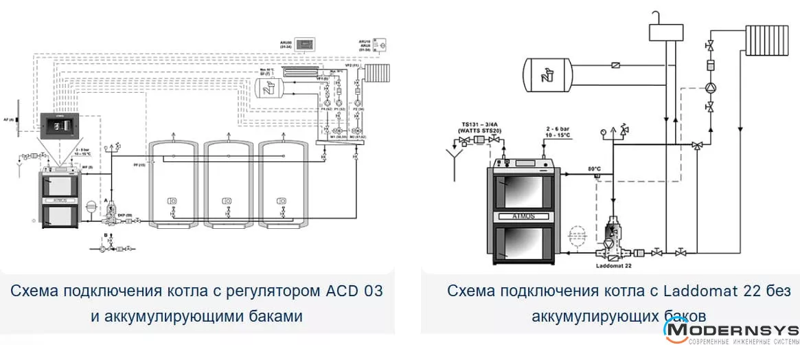 При монтажі рекомендується використовувати оригінальний комплект підключення ATMOS, наприклад F71 ESBE, F1-F4, F12 Laddomat, F21-F22 (тільки контур котла) або F31 і F32 AKU у разі підключення до накопичувальних баків. Після котла ATMOS необхідно створити так званий контур котла, що містить LADDOMAT 22 або термостатичний клапан (для електронного контролера ACD 03/04 – триходовий клапан, керований серводвигуном), з мінімальною температурою зворотної води в котлі. 65 °С. Температуру води на виході з котла необхідно постійно підтримувати в межах 80 – 90 °С, а на триходовому змішувальному крані виставляємо температуру води на радіатори або теплу підлогу в міру необхідності (напр. 30 – 80 °С). Усі котли у стандартній комплектації поставляються з контуром охолодження для захисту від перегріву. Встановіть котли з накопичувальними баками, щоб знизити витрати пального та підвищити комфорт опалення.