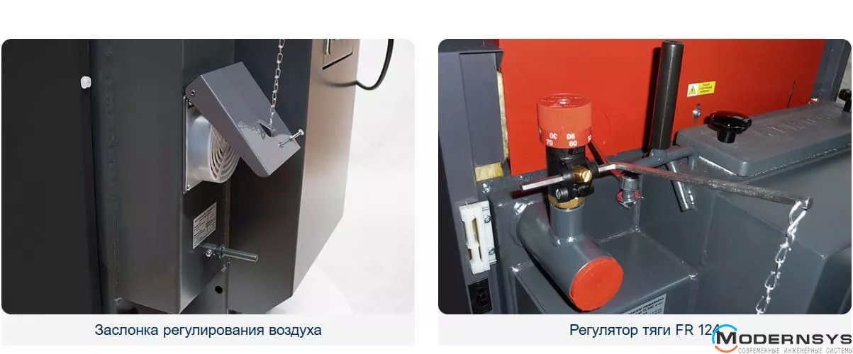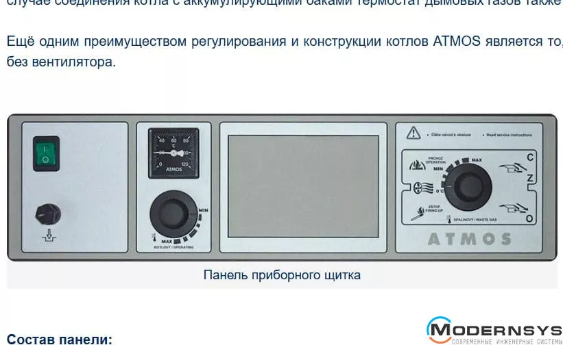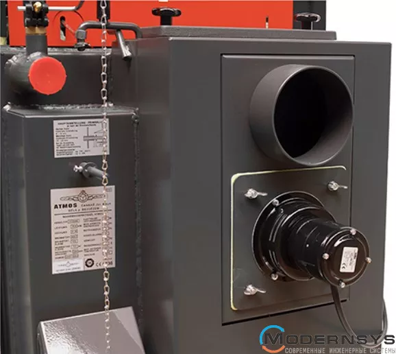 Електромеханічне регулювання – потужність котла регулюється повітряним заслінком, керованим регулятором тяги типу FR 124, який автоматично відкриває або закриває повітряну заслінку в залежності від заданої температури води на виході (80 – 90 °C). Крім регулювання потужності регулятор тяги допомагає захистити котел від перегріву. Його перевага полягає в швидкому розпалюванні та підвищенні потужності до необхідного значення при повністю відкритій повітряній заслінці. Котли оснащені регулюючим термостатом на панелі приладів, який керує витяжним вентилятором в залежності від заданої температури води на виході (80 — 85 °C), і термостатом димових газів, який використовується для відключення котла і вимкнення витяжного вентилятора після того, як догорить паливо. У разі з'єднання котла з баками, що акумулюють, термостат димових газів також управляє роботою насоса в котловому контурі. Ще однією перевагою регулювання та конструкції котлів ATMOS є те, що котли працюють при гарній тязі димоходу до 70% номінальної потужності навіть без вентилятора.