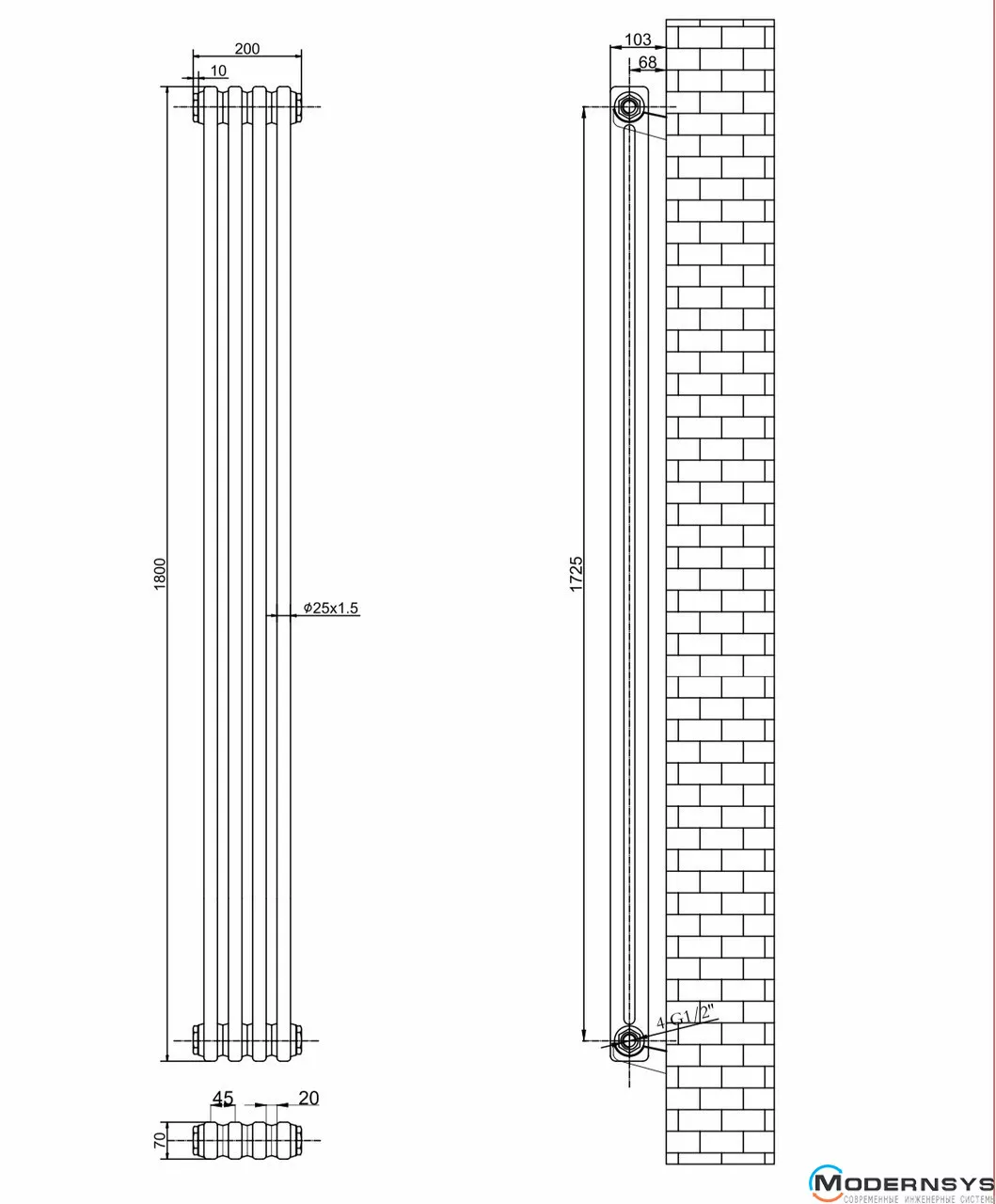 Технічні характеристики: Вертикальний дизайнерський радіатор ARTTIDESIGN (Арттидизайн) Bari II 4/1800/200 чорний матовий
