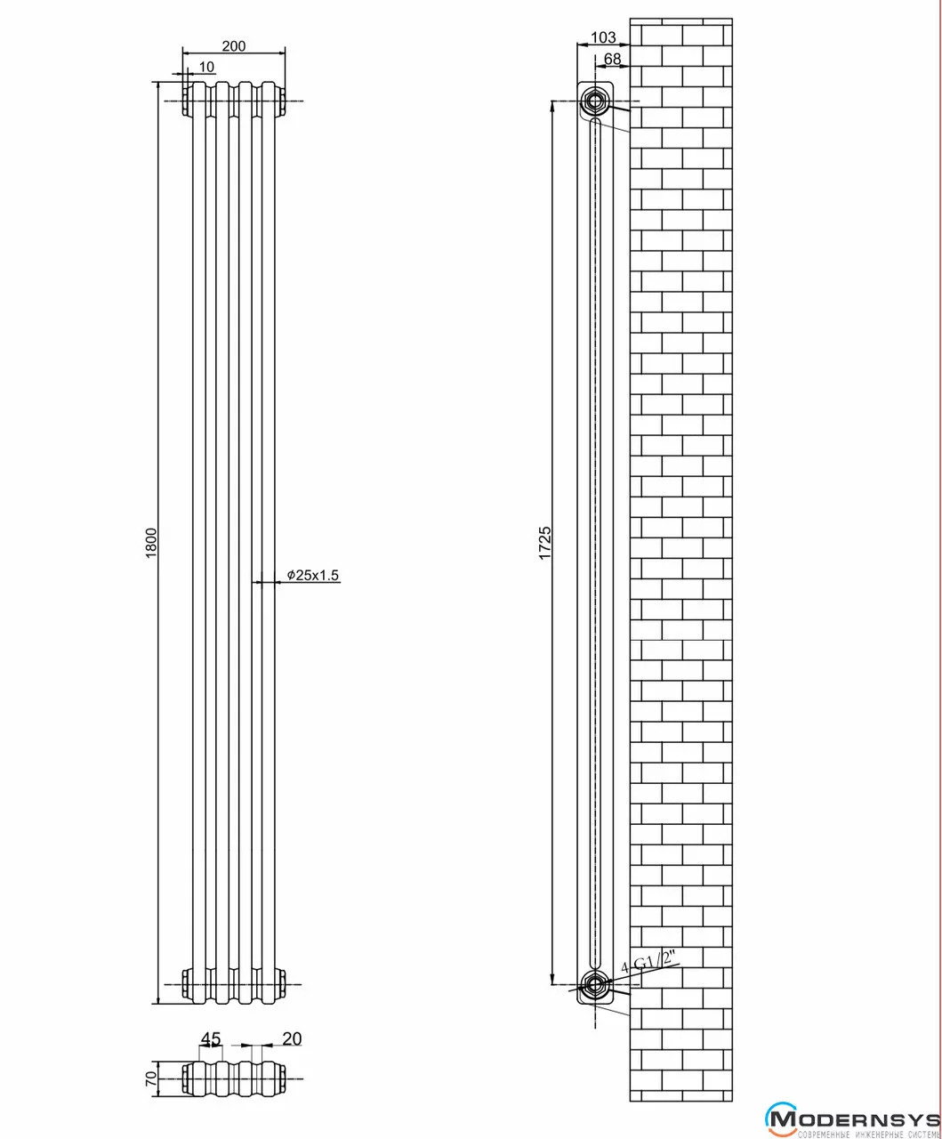 Технічні характеристики: Вертикальний дизайнерський радіатор ARTTIDESIGN (Арттидизайн) Bari II 4/1800/200 сірий матовий