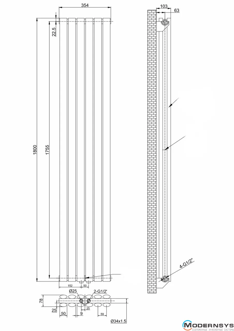 Технічні характеристики: Вертикальний дизайнерський радіатор ARTTIDESIGN (Арттидизайн) Rimini II 6/1800/354/50 сірий матовий
