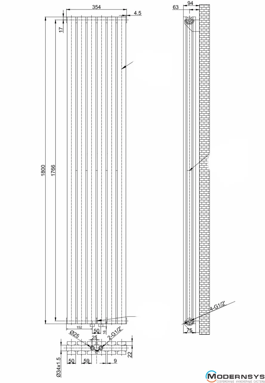 Технічні характеристики: Вертикальний дизайнерський радіатор ARTTIDESIGN (Арттидизайн) Terni II 6/1800/354/50 сірий матовий