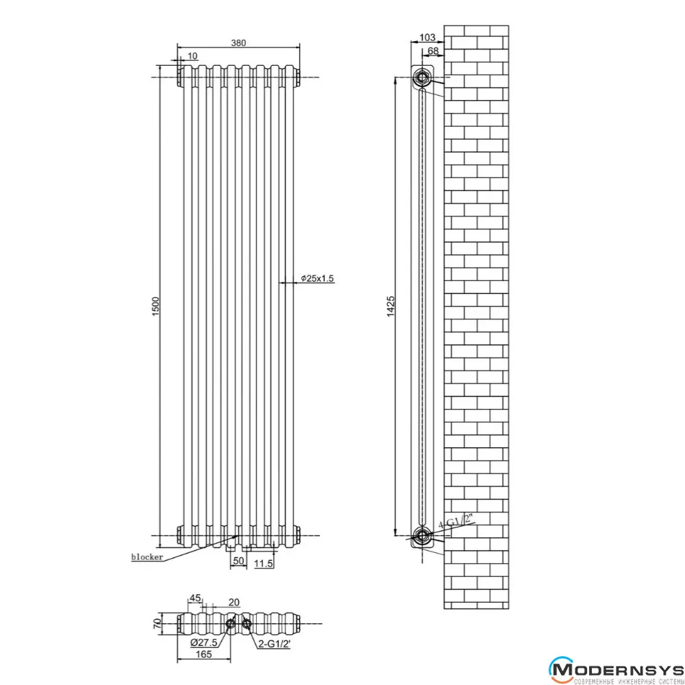Технічні характеристики: Вертикальний радіатор опалення ARTTIDESIGN (Арттидизайн) Bari II 8/1500/380/50 чорний матовий