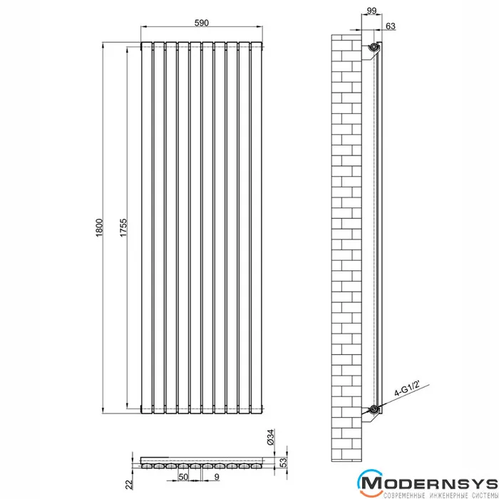 Технічні характеристики: Вертикальний дизайнерський радіатор опалення ARTTIDESIGN (Арттидизайн) Terni 10/1800/590 сірий матовий