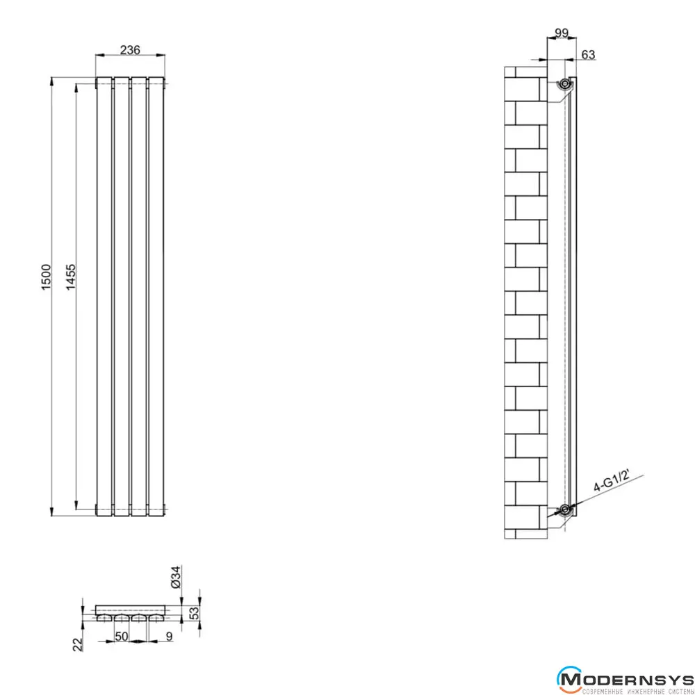 Технічні характеристики: Вертикальний радіатор опалення ARTTIDESIGN (Арттидизайн) Terni 4/1500/236/50 білий матовий