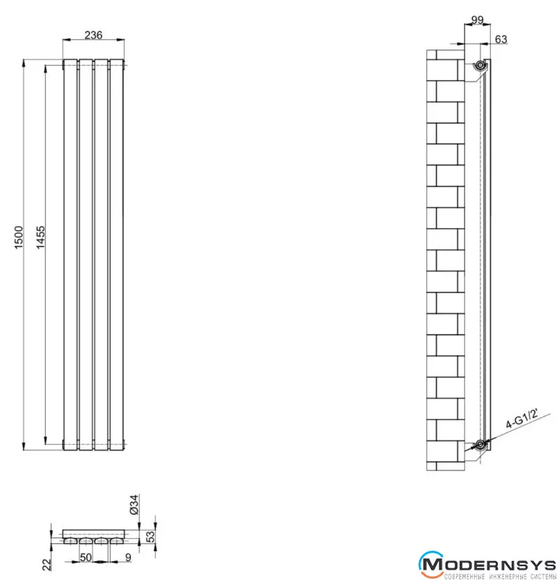 Технічні характеристики: Вертикальный дизайнерский радиатор отопления ARTTIDESIGN (Арттидизайн) Terni 4/1500/236/50 черный матовый