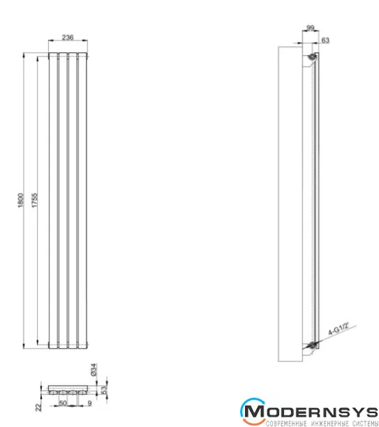 Технічні характеристики: Вертикальный дизайнерский радиатор отопления ARTTIDESIGN (Арттидизайн) Terni 4/1800/236/50 черный матовый