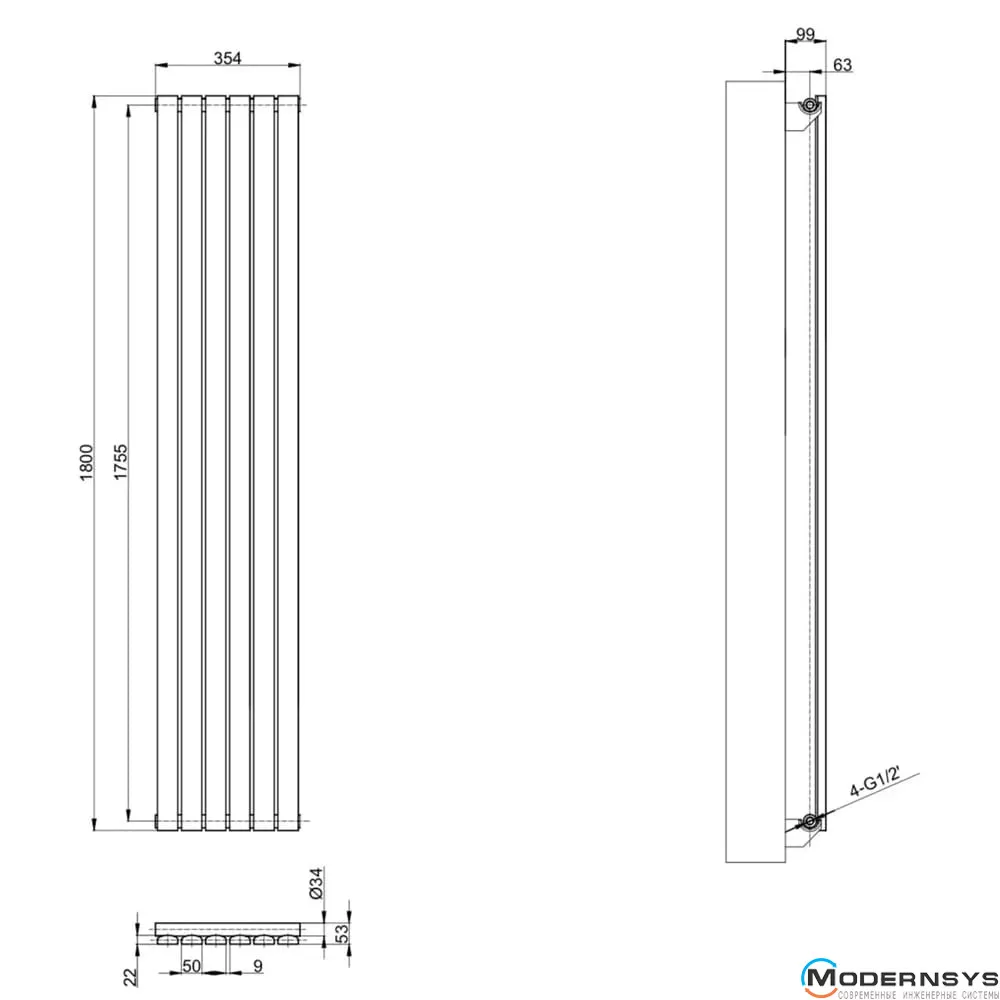 Технічні характеристики: Вертикальний радіатор опалення ARTTIDESIGN (Арттидизайн) Terni 6/1800/354/50 білий матовий
