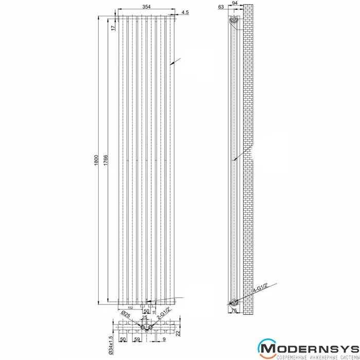 Технічні характеристики: Вертикальний дизайнерський радіатор опалення ARTTIDESIGN (Арттидизайн) Terni II 6/1800/354/50 чорний матовий