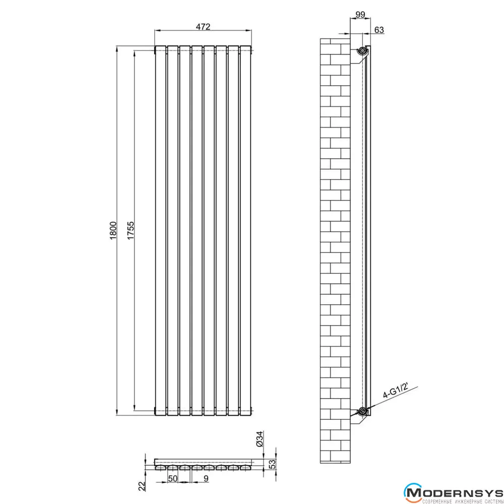 Технічні характеристики: Вертикальний радіатор опалення ARTTIDESIGN (Арттидизайн) Terni 8/1800/472/50 білий матовий