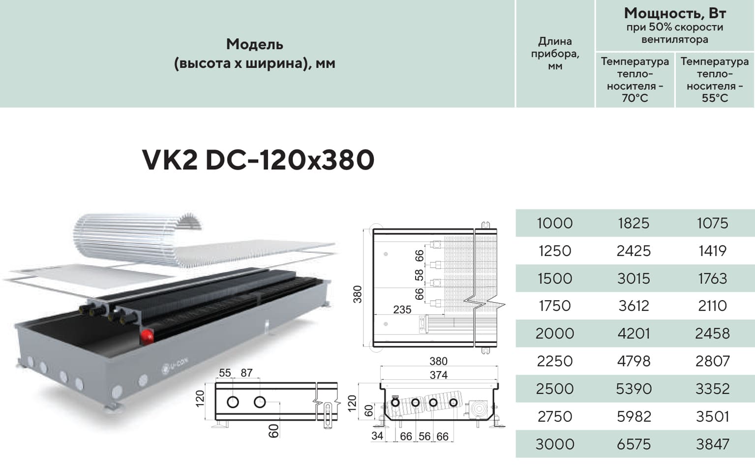 Технічні характеристики: Внутрішньопідлоговий конвектор U-CON (Юкон) VK2 DC 360/2500/67