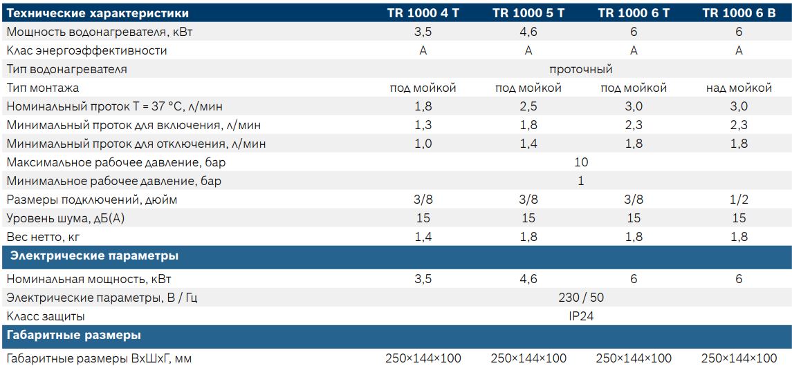 Технічні характеристики для водонагрівачів Bosch TR 1000 T