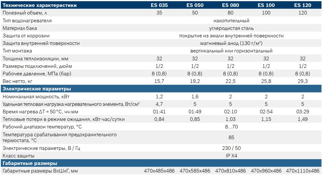 Технічні характеристики для водонагрівачів Bosch Tronic 8000 T ES BO H1X-EDWVB