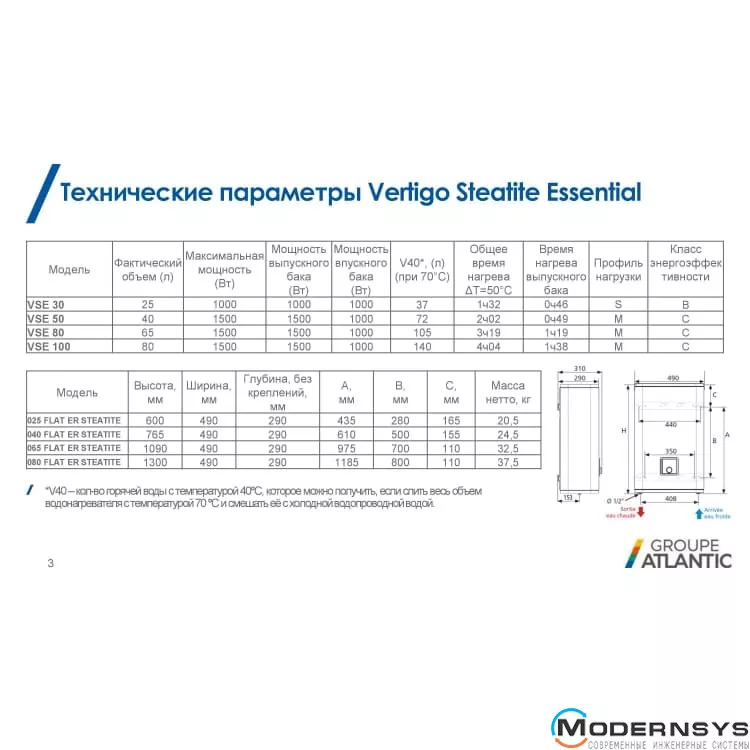 Технічні характеристики: Водонагрівач електричний Atlantic (Атлантик) Vertigo Steatite Essential 50 MP-040 2F 220E-S (1500W)