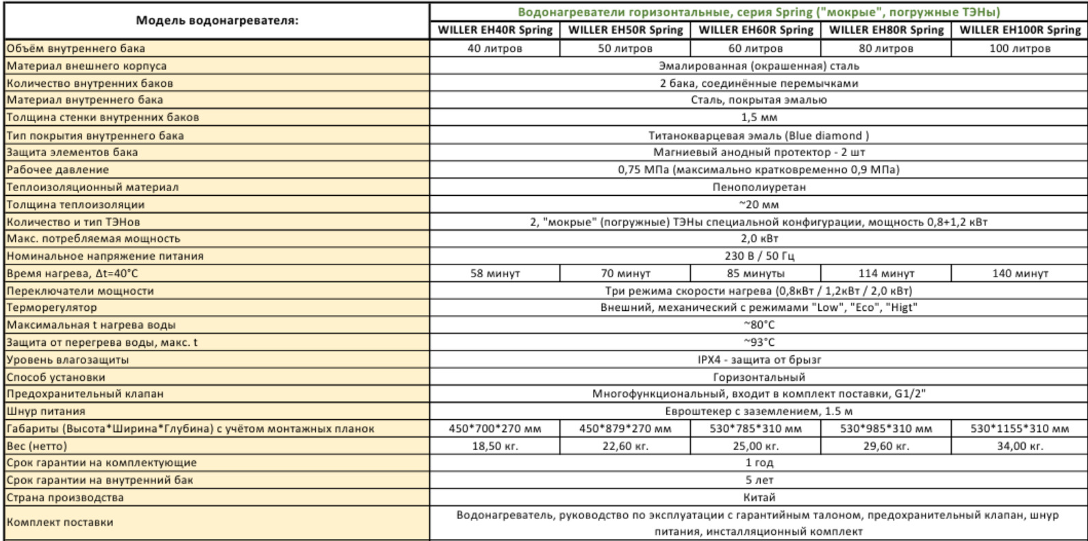 Технічні характеристики: Водонагрівач Willer (Виллер) EH50R Spring горизонтальний (колір чорний матовий)