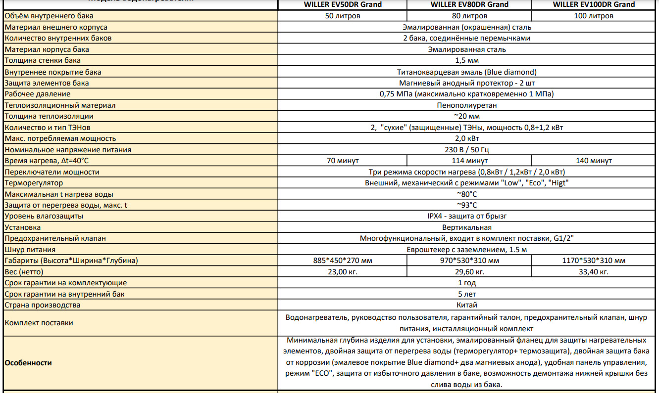 Технічні характеристики: Водонагрівач Willer (Виллер) EV100DR Grand вертикальний (колір чорний матовий)