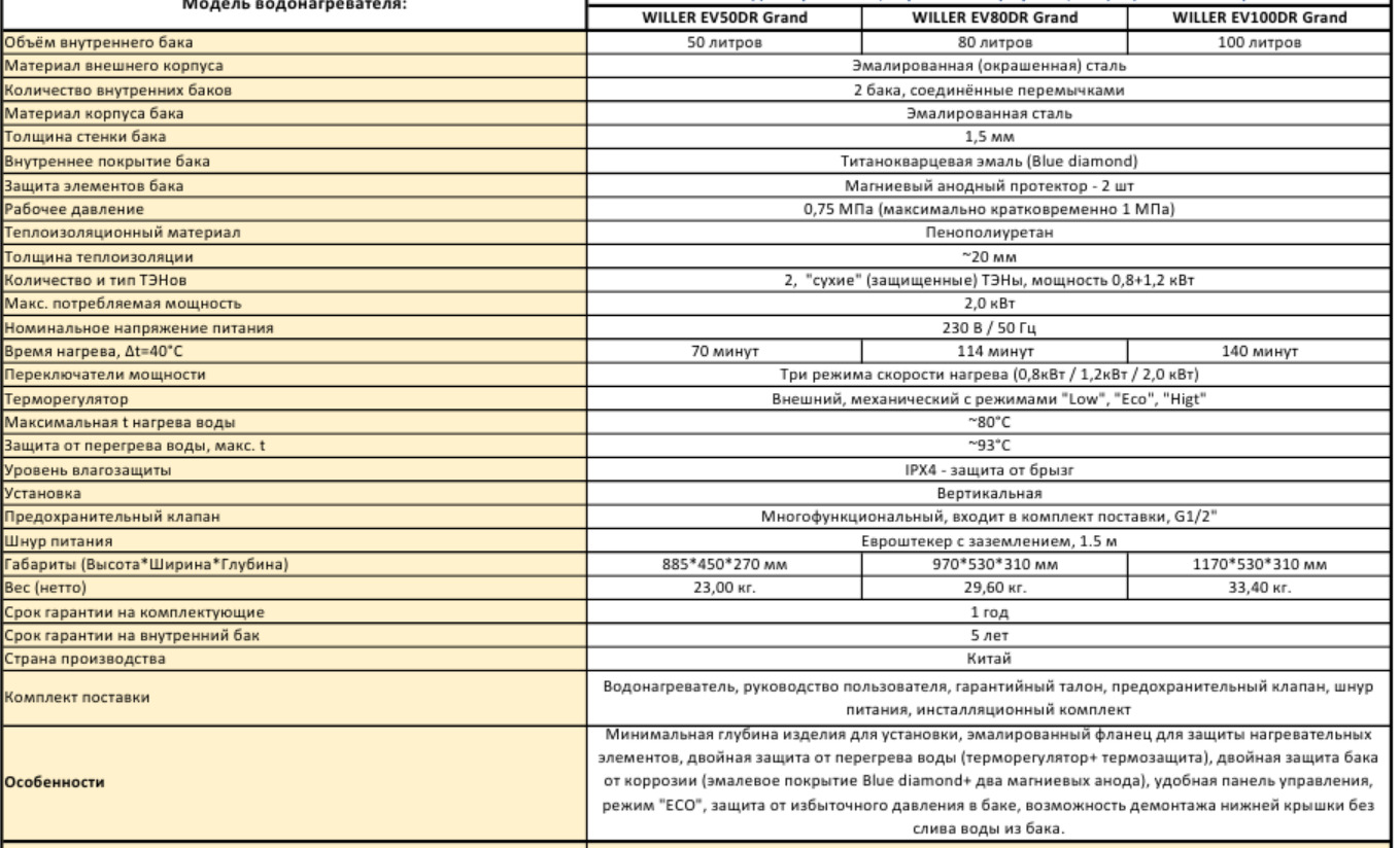 Технічні характеристики: Водонагрівач Willer (Виллер) EV80DR Grand вертикальний