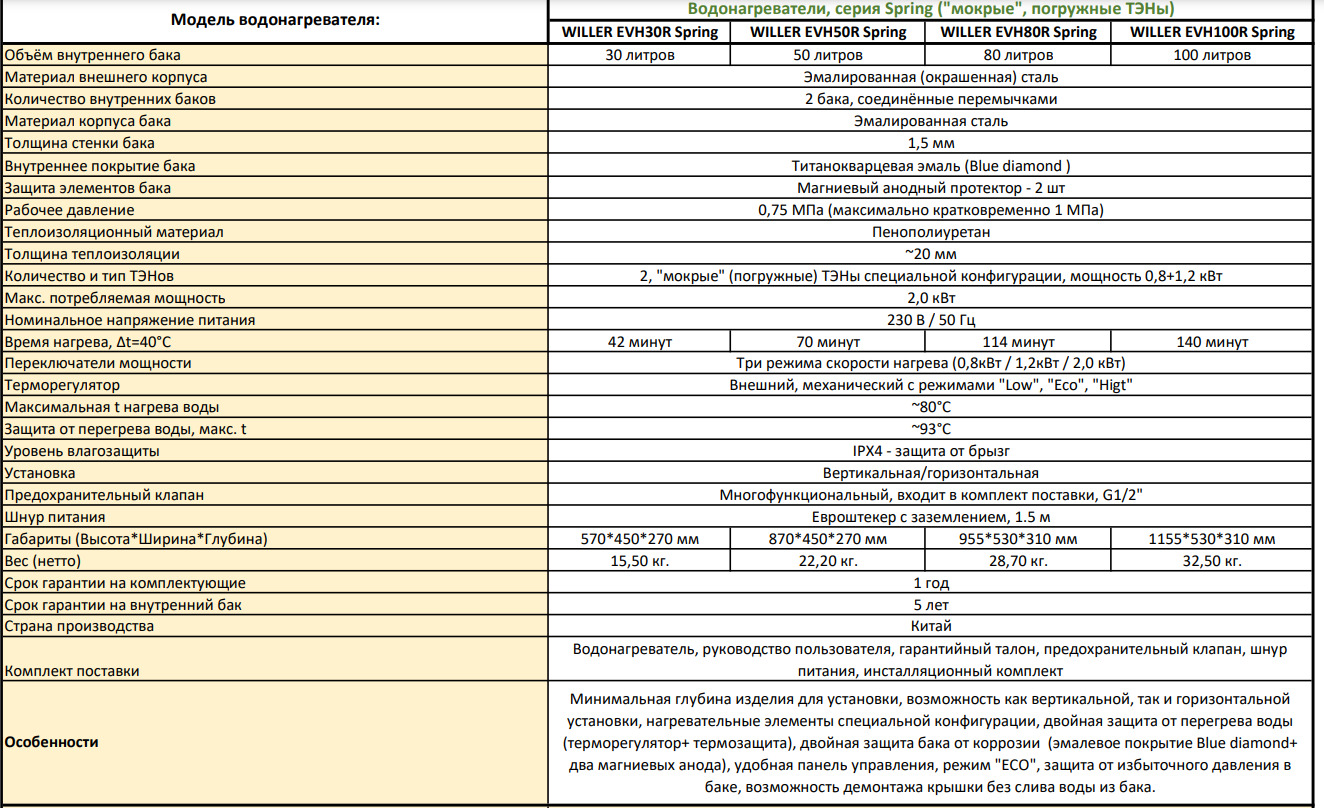Технічні характеристики: Водонагрівач Willer (Виллер) EVH50R Spring універсальний