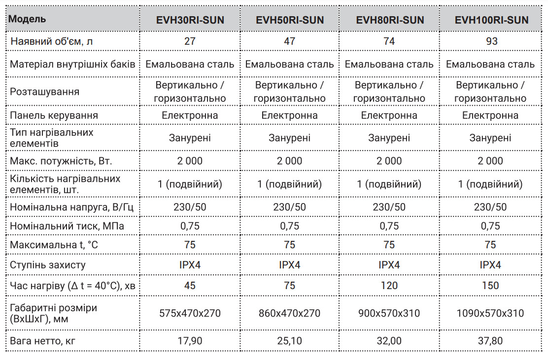 Технічні характеристики: Водонагрівач Willer (Виллер) EVH50RI-SUN універсальний